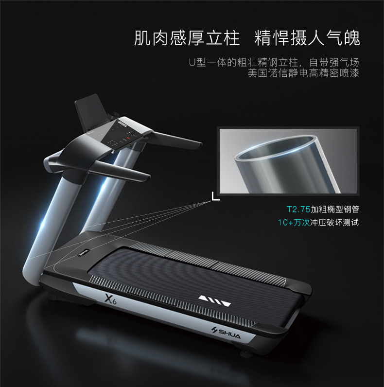 熊猫体育推荐健身器材-舒华商用电动跑步机SH-T6500拥有10.1寸IPS高清触摸屏、Z型动感时尚外观设计、70×150mm精钢立柱机身、F级高效静音马达、520mm商用豪华跑带和35mm双层全跑台减震跑板等优势,让您享受科学跑步。